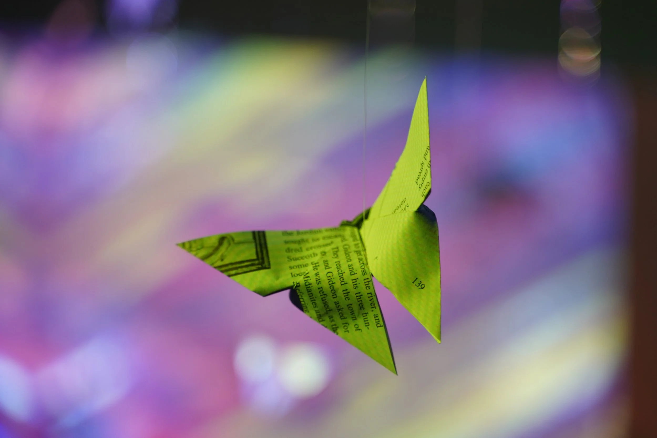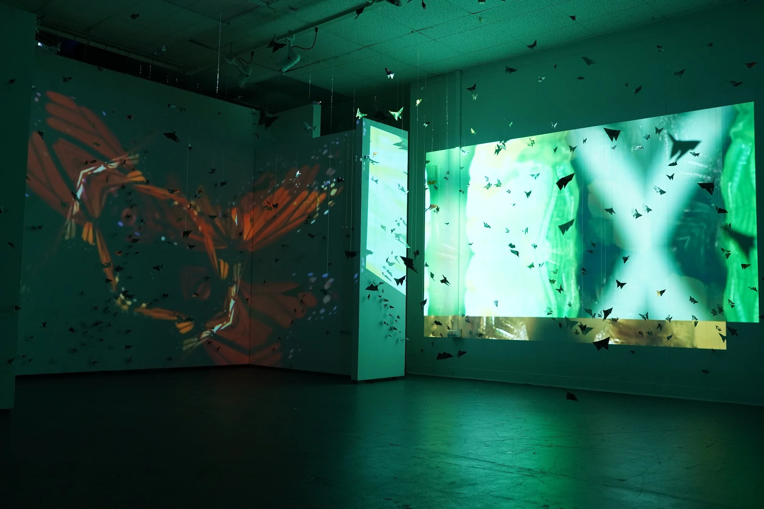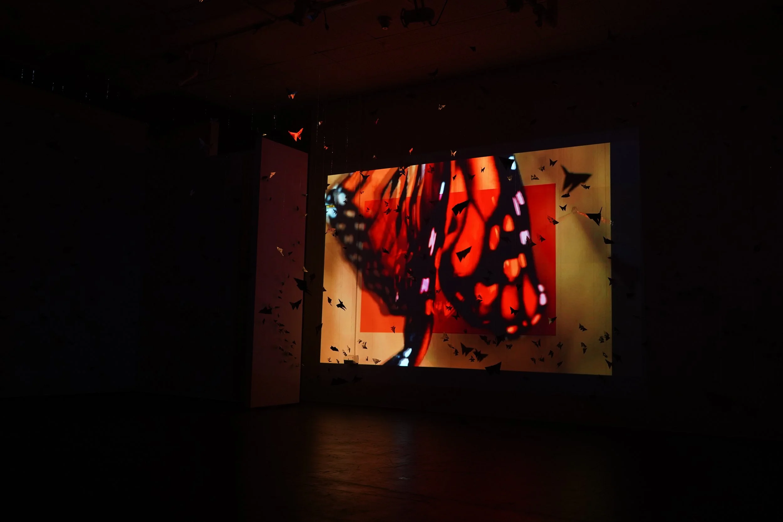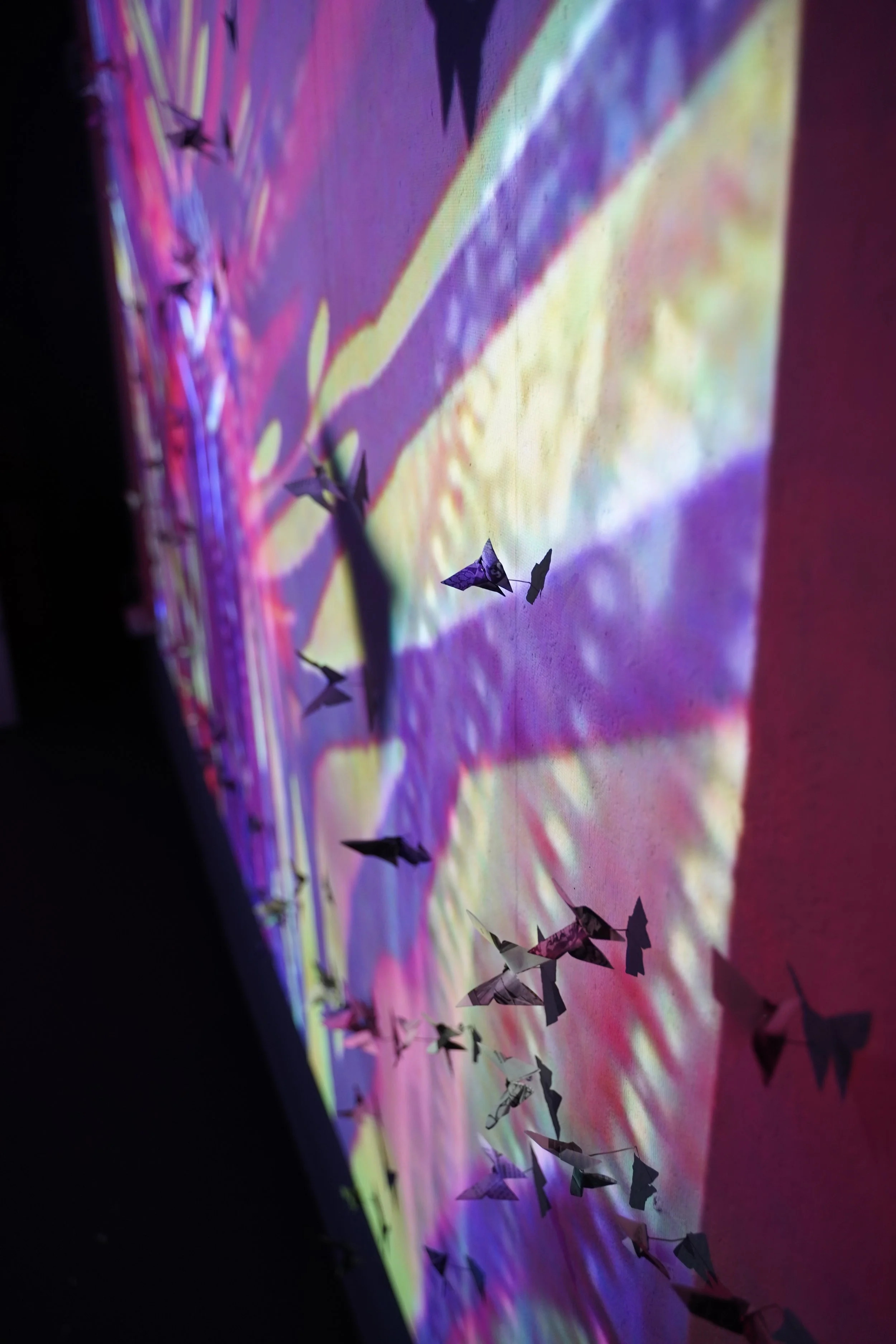 Folded paper butterflies suspended on fishing line, tacked to drywall, projection and audio.