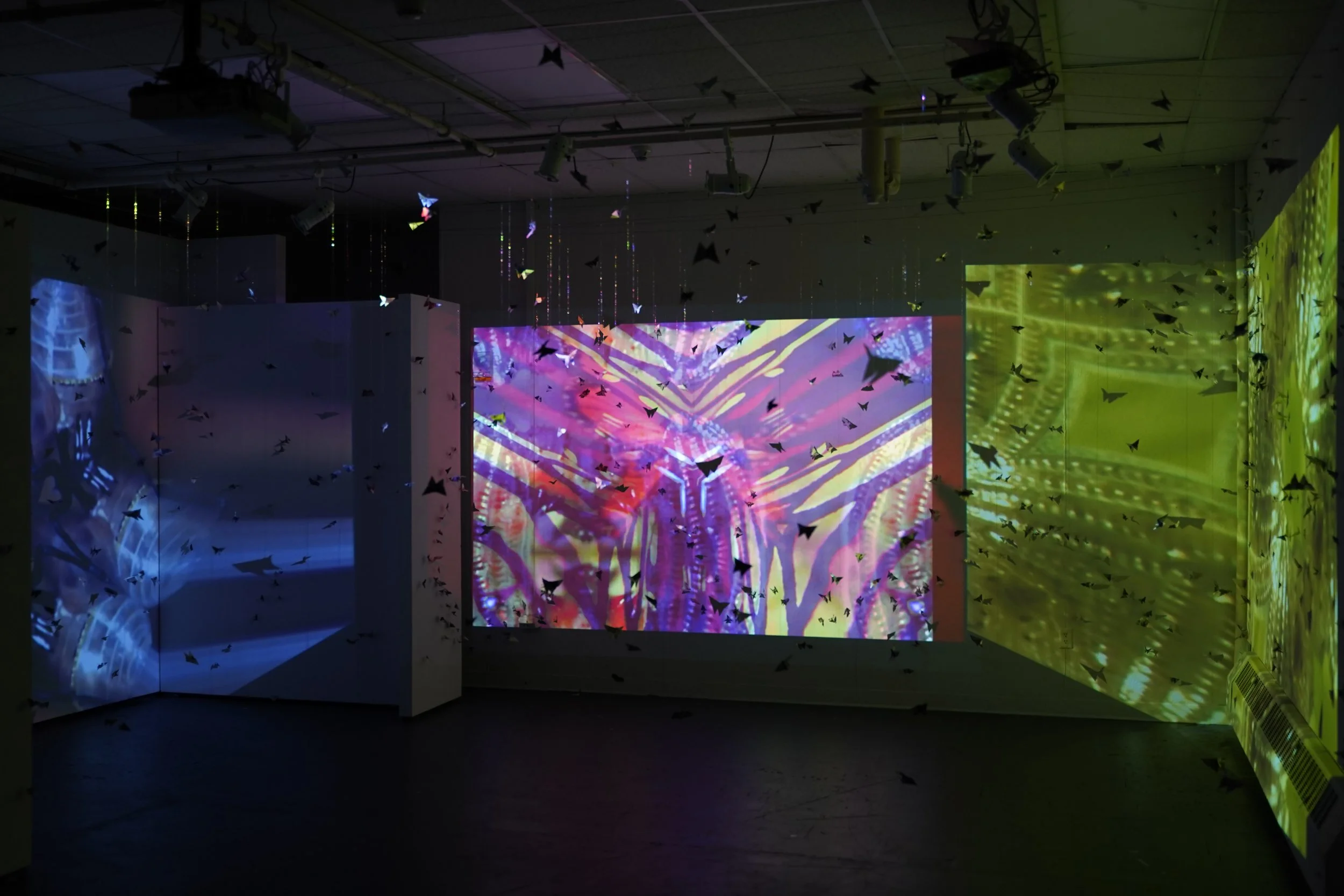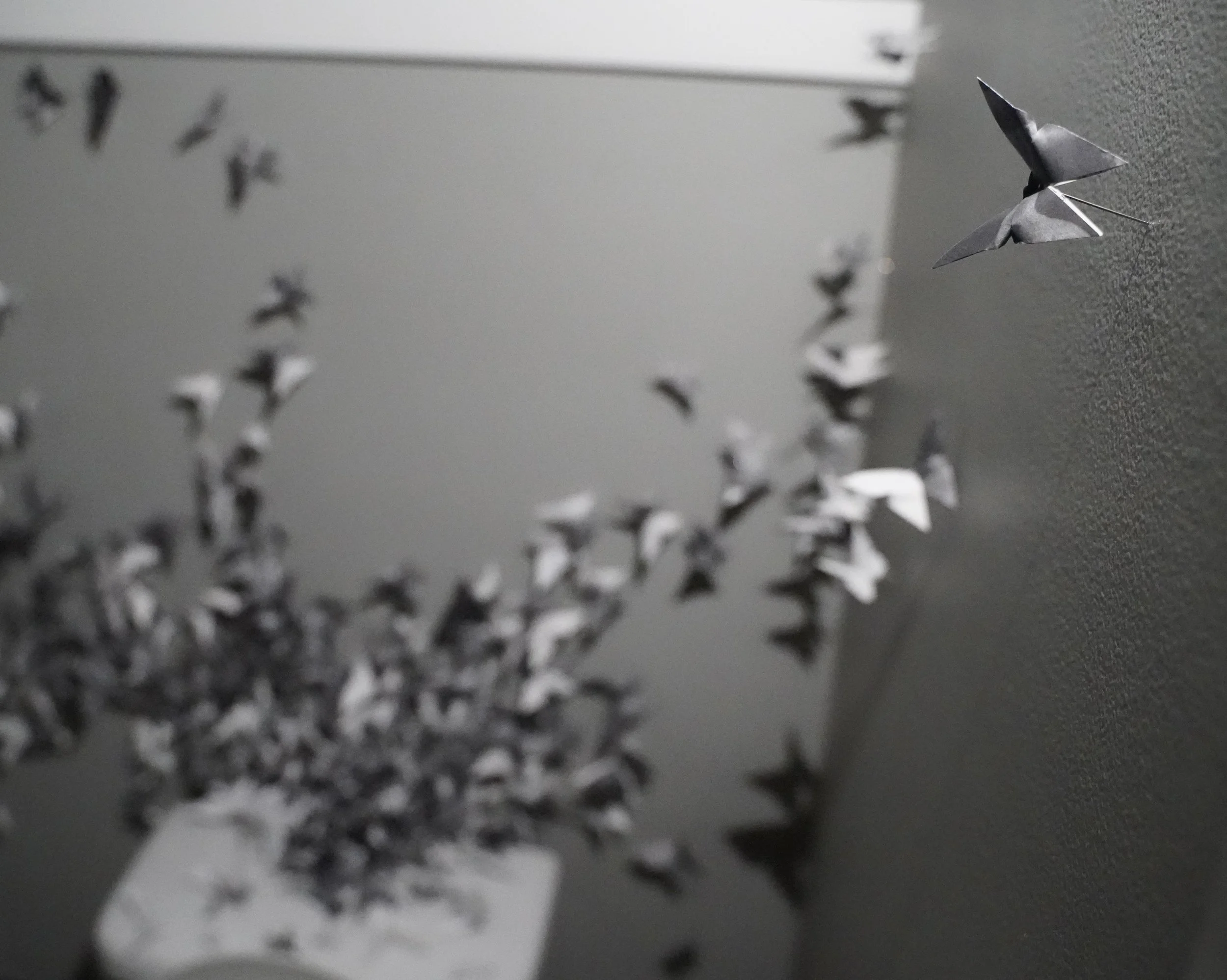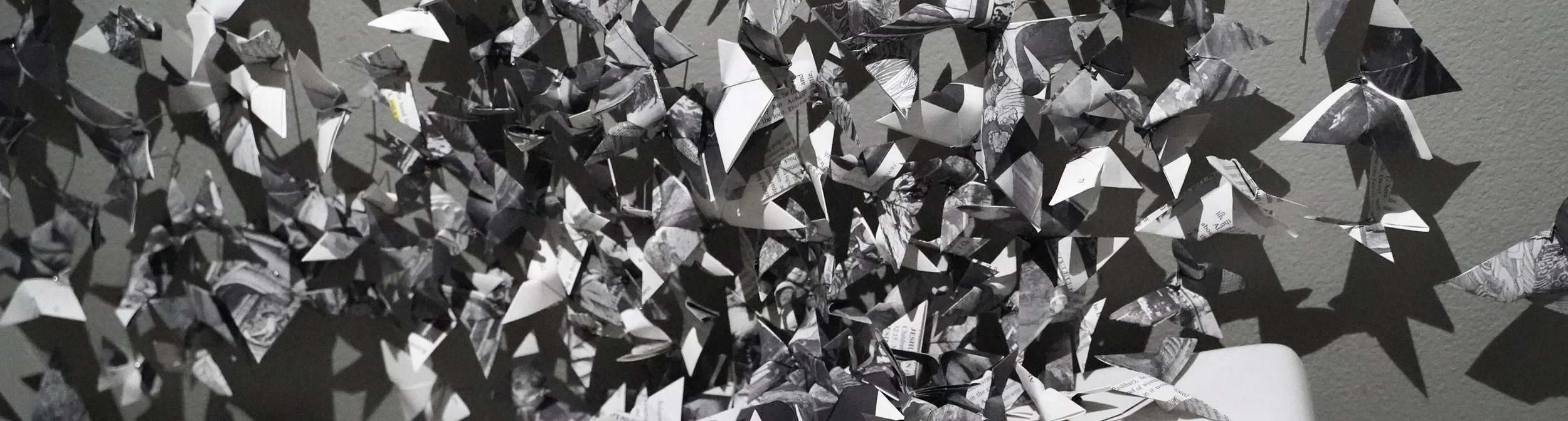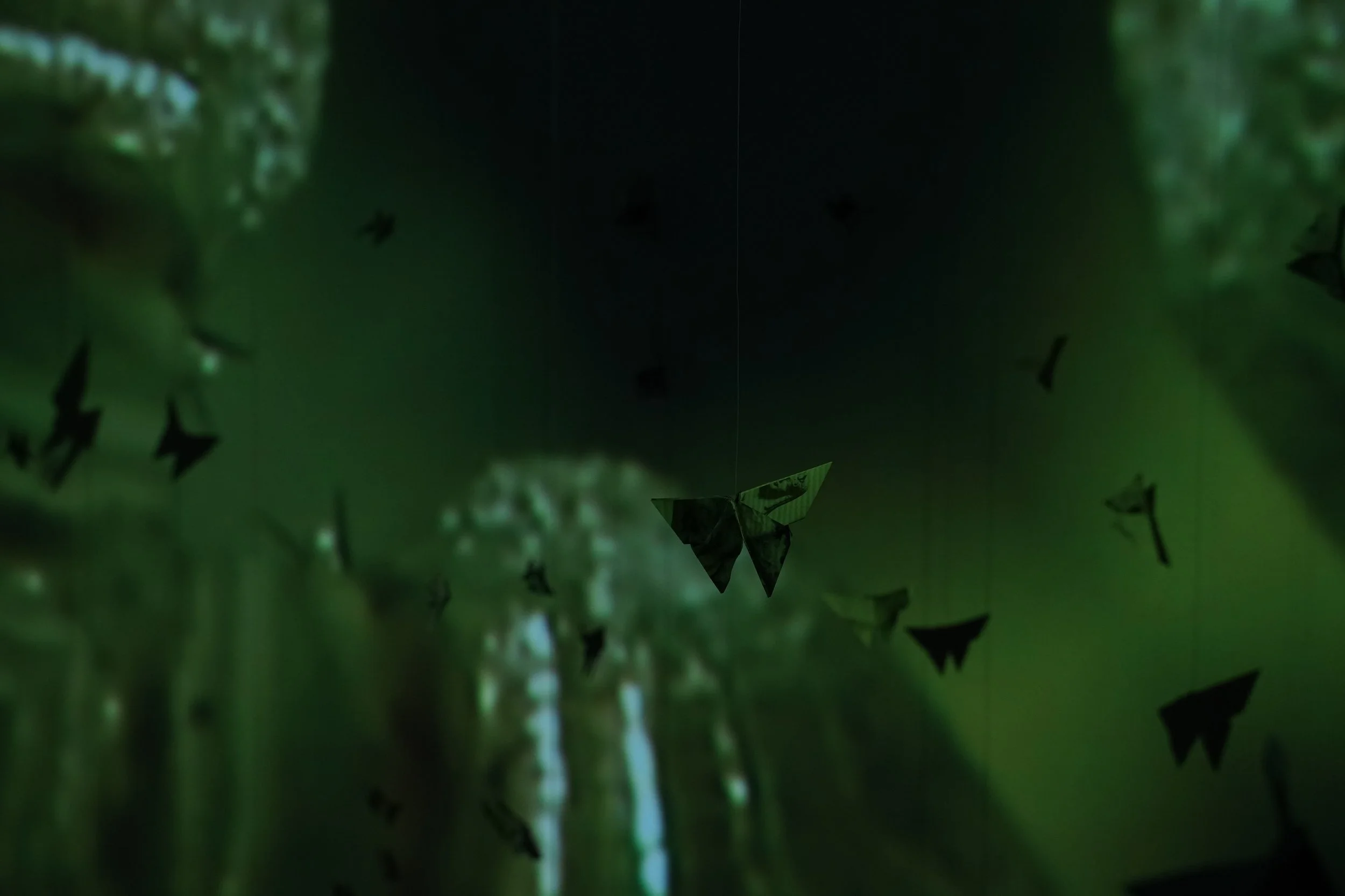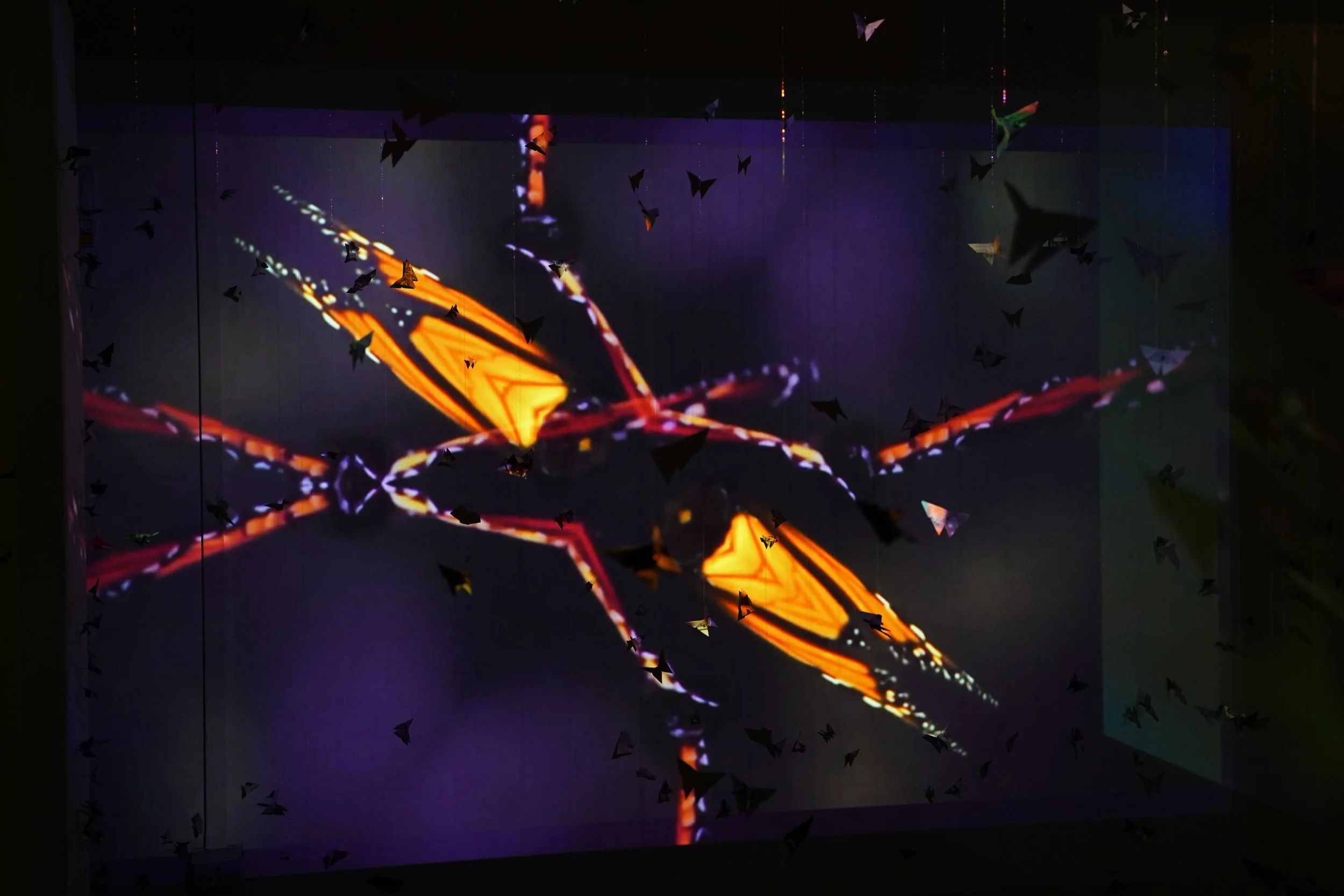 Folded paper butterflies suspended on fishing line, tacked to drywall, projection and audio.