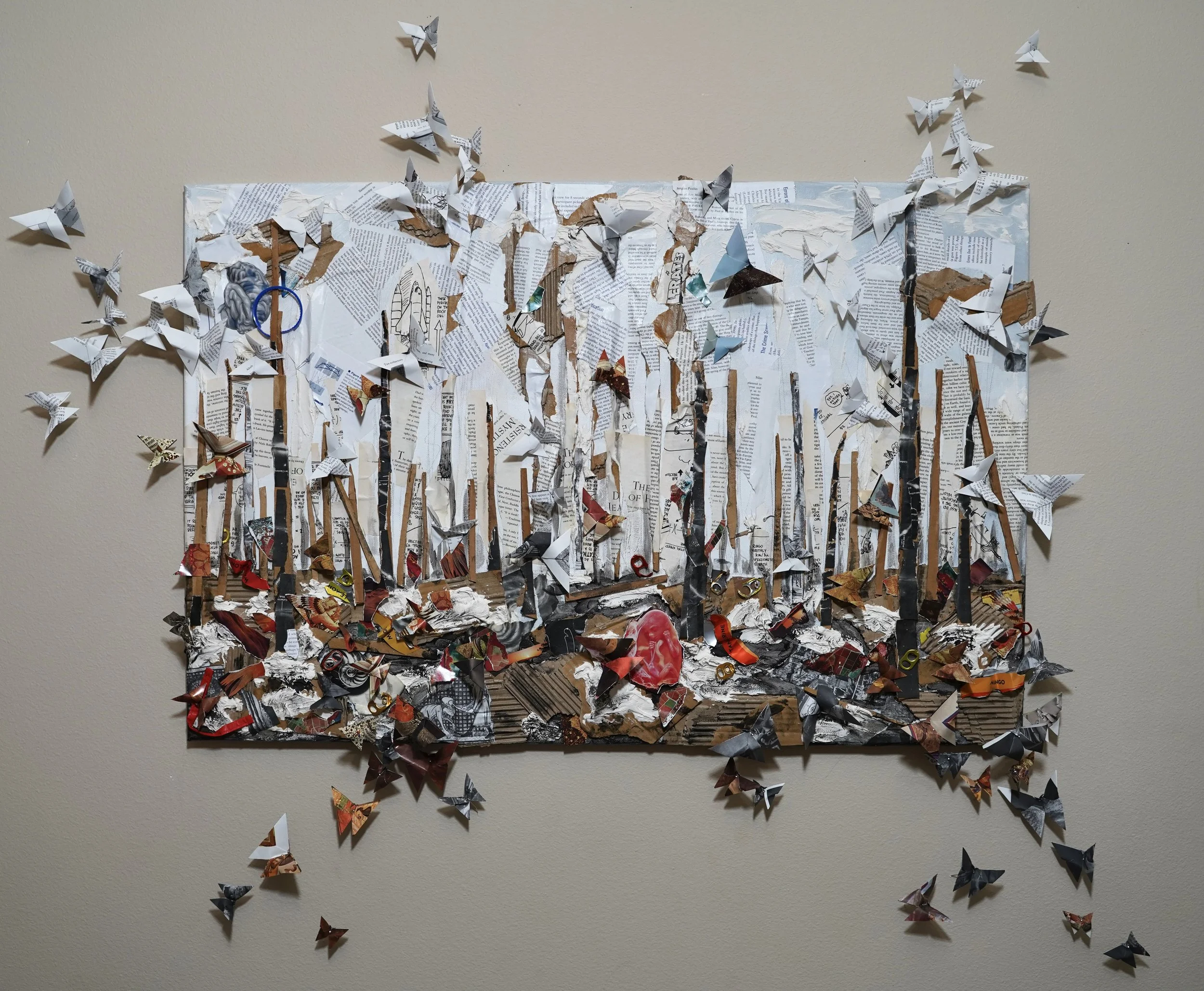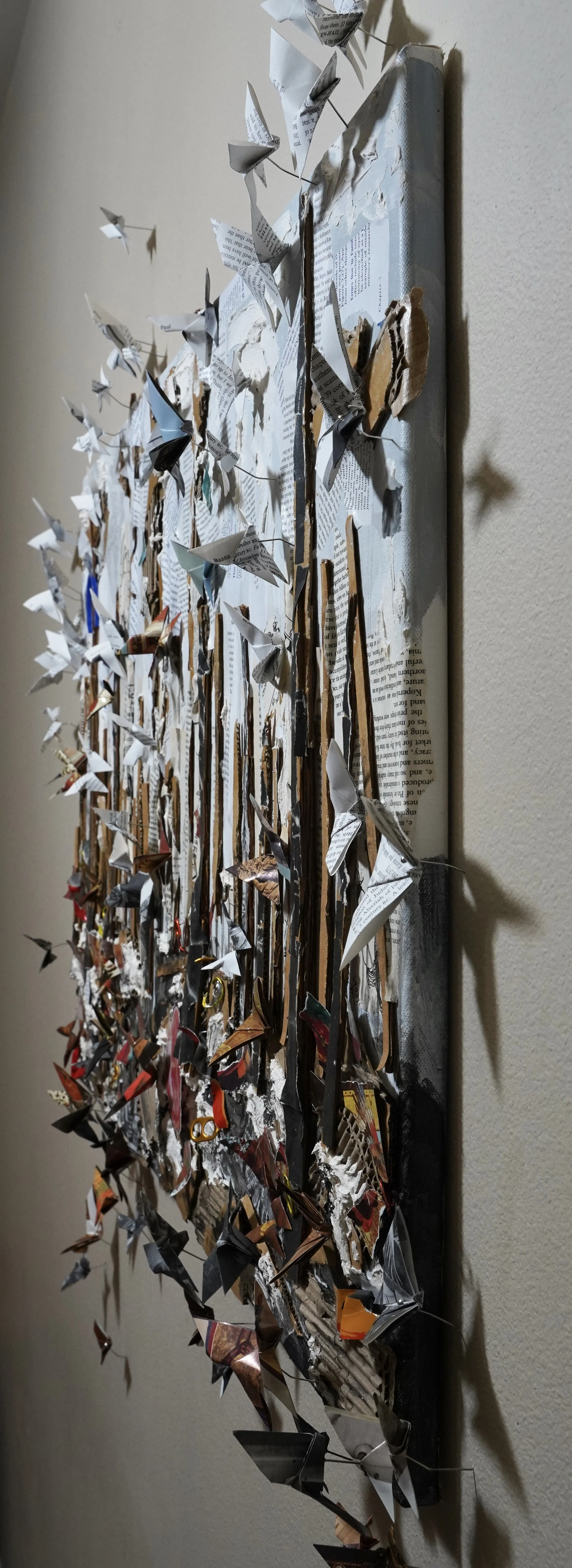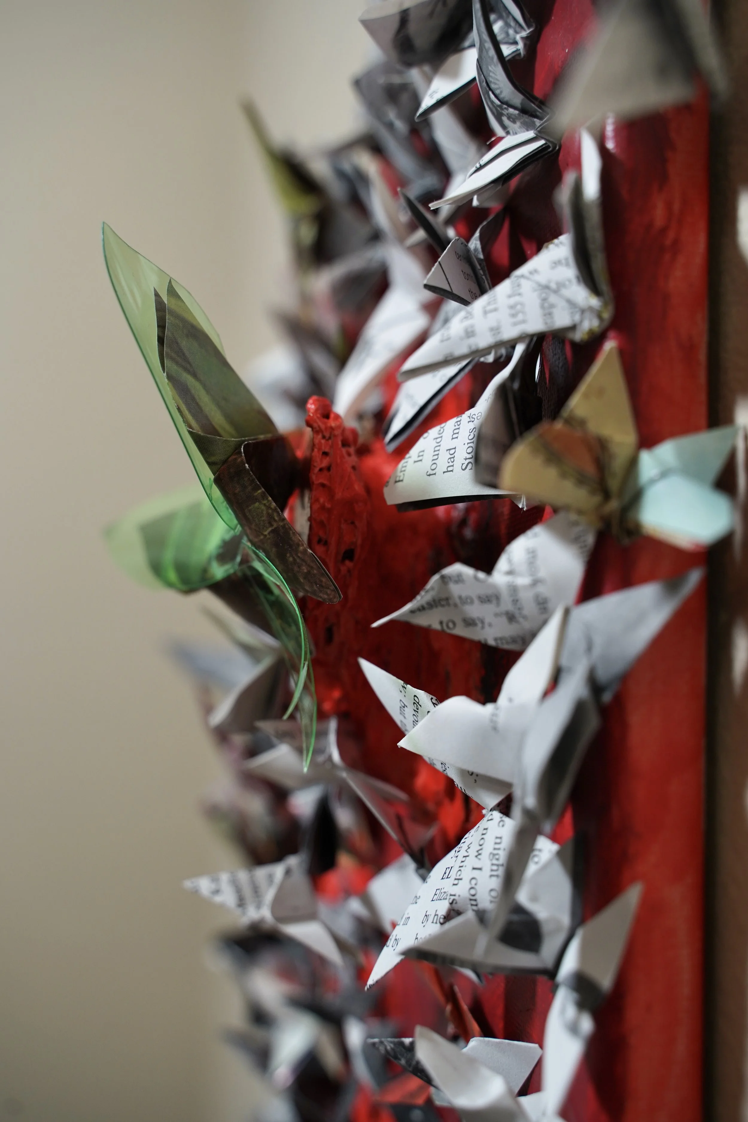 Folded paper, plastic butterflies adhered to canvas. Cardboard, acrylic.