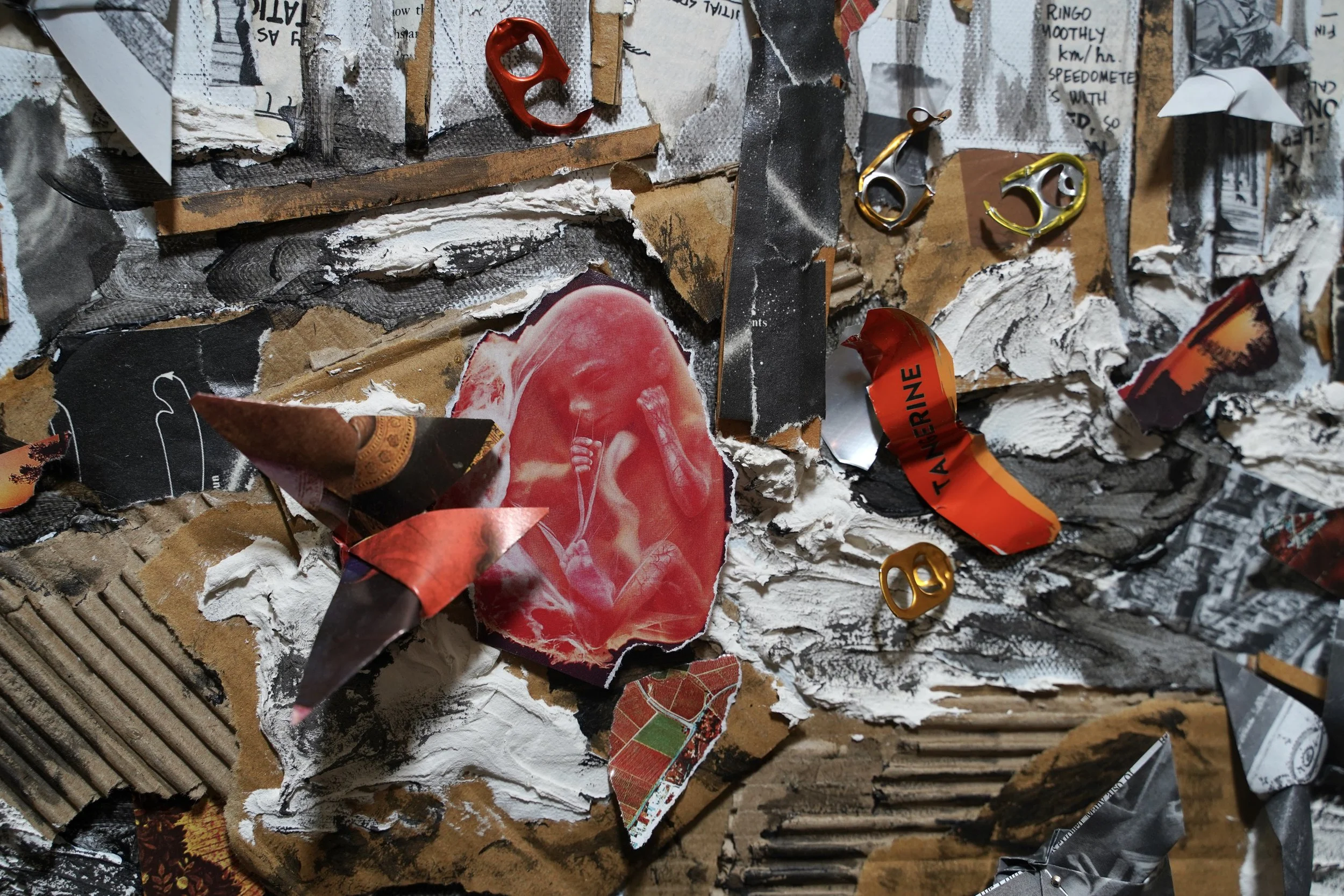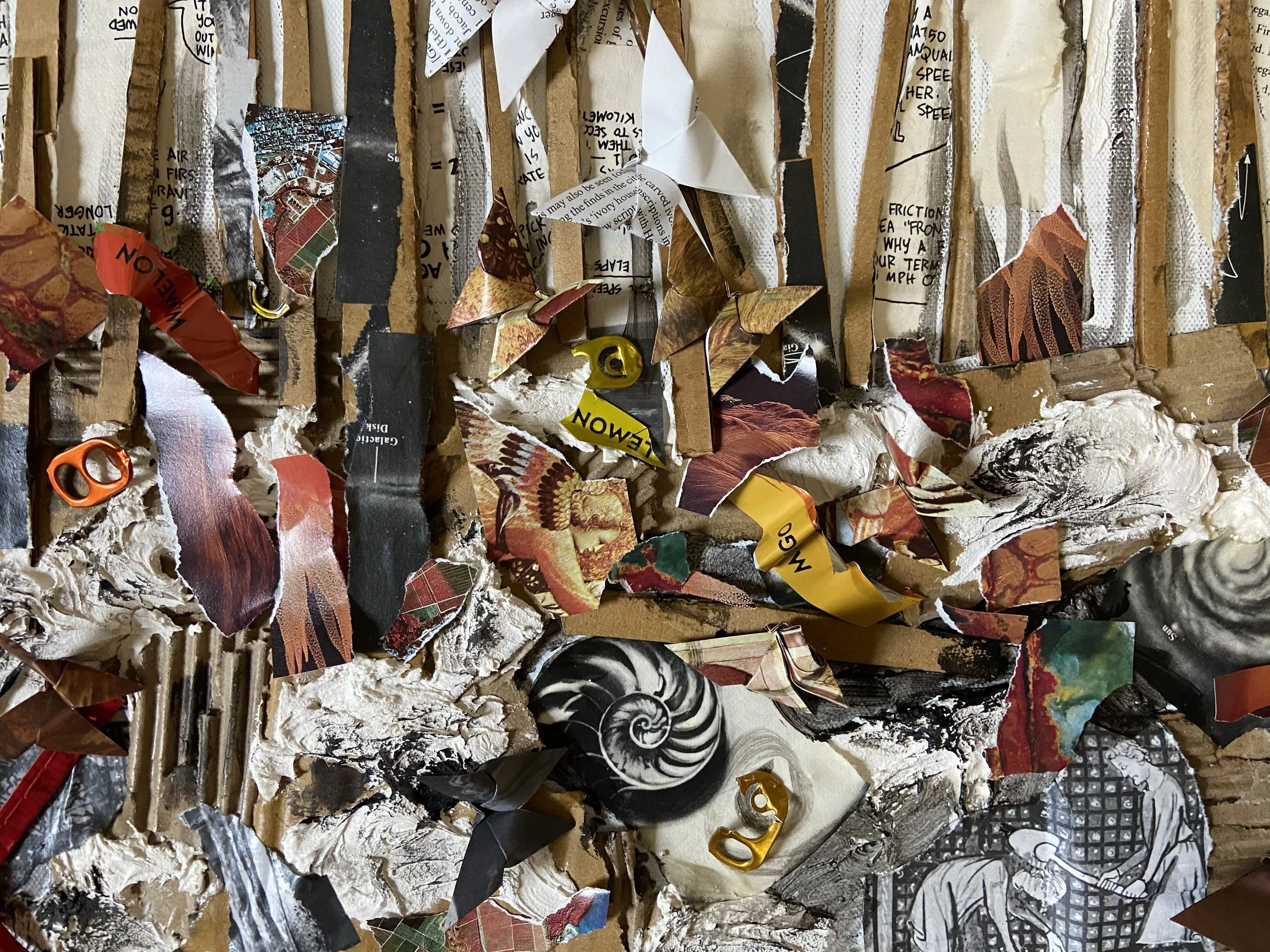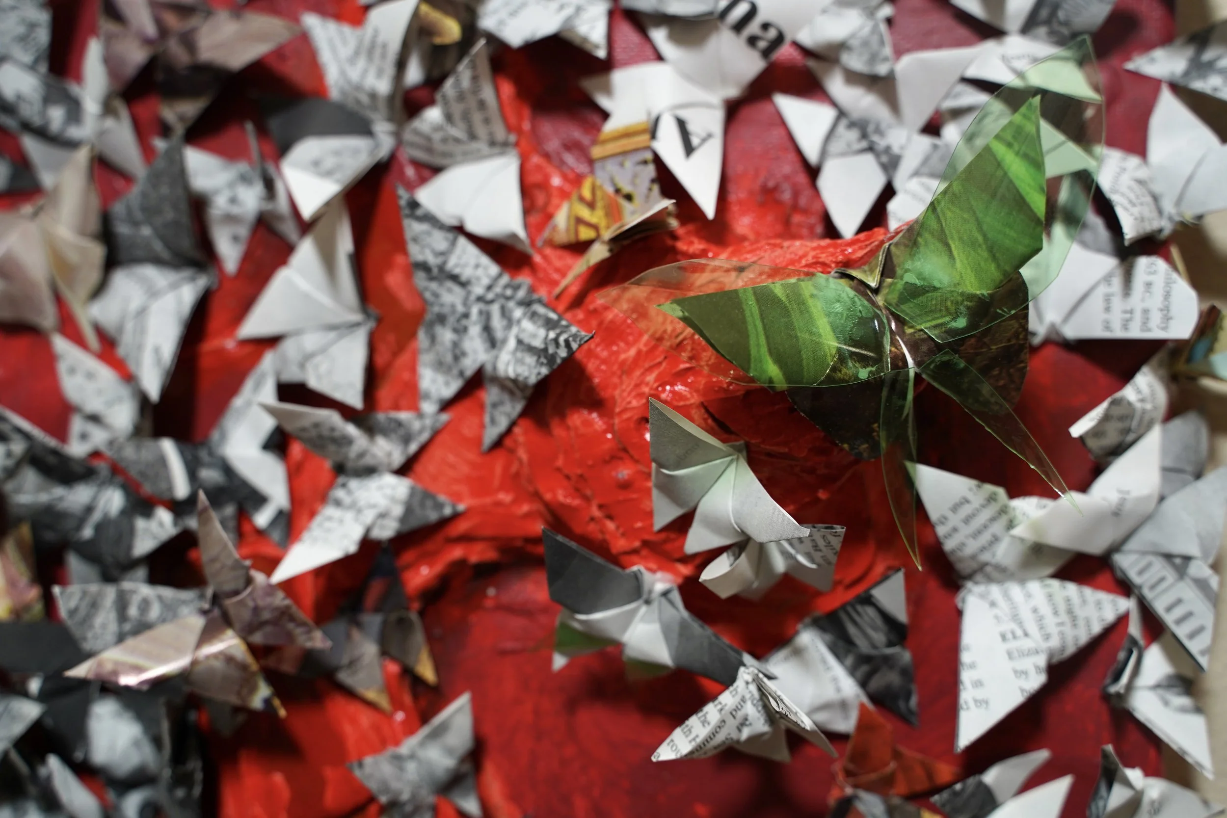Folded paper, plastic butterflies adhered to canvas. Cardboard, acrylic.