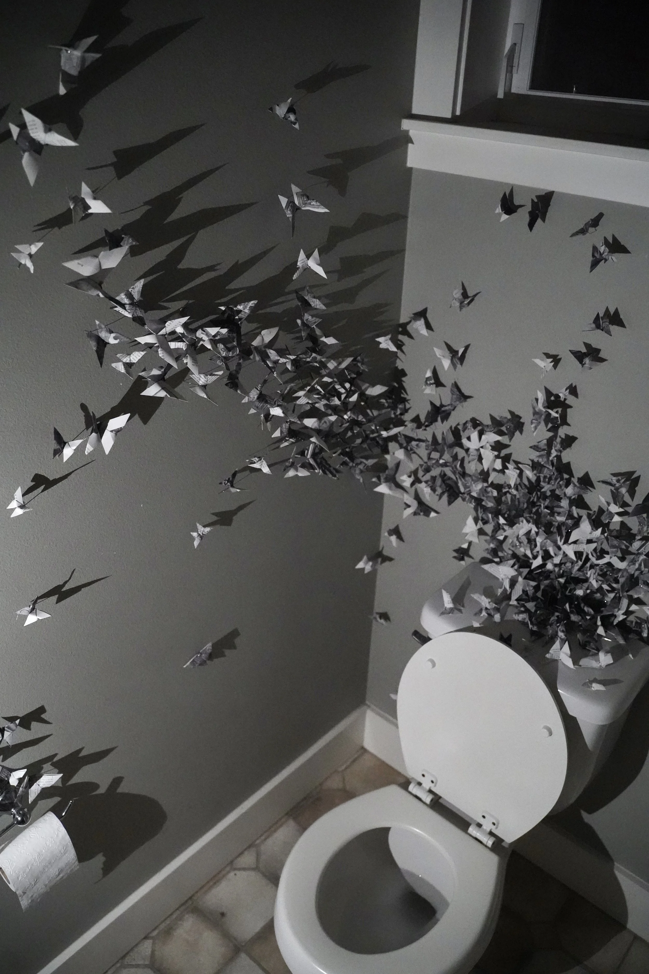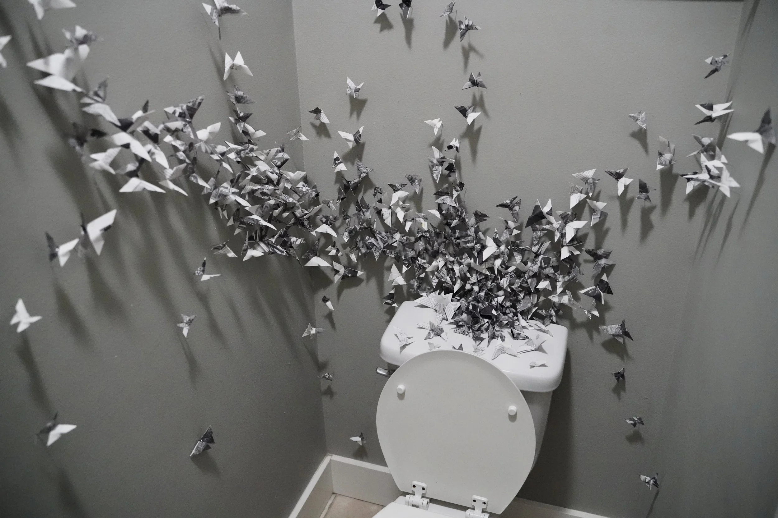 Folded paper butterflies suspended tacked to drywall, existing toilet.