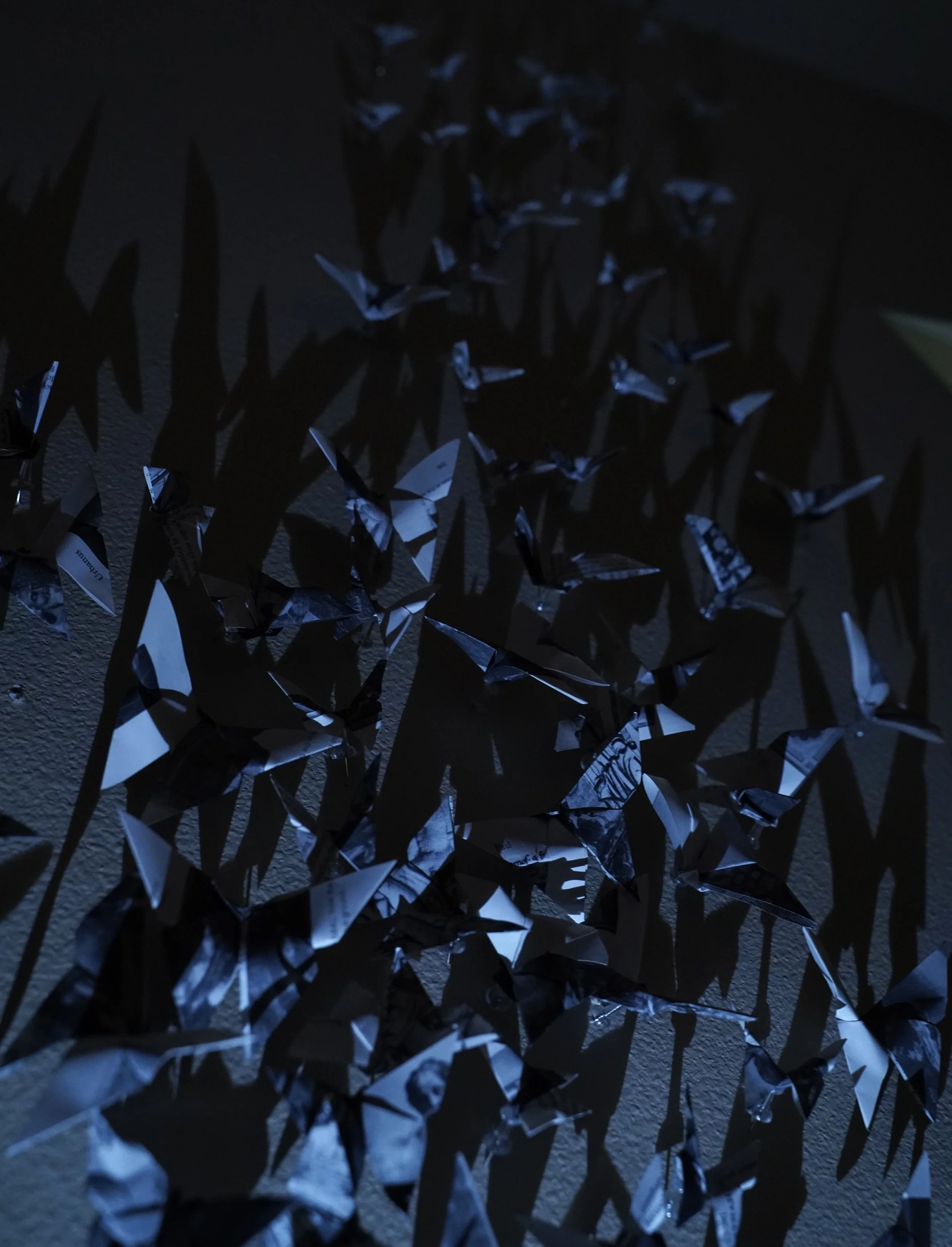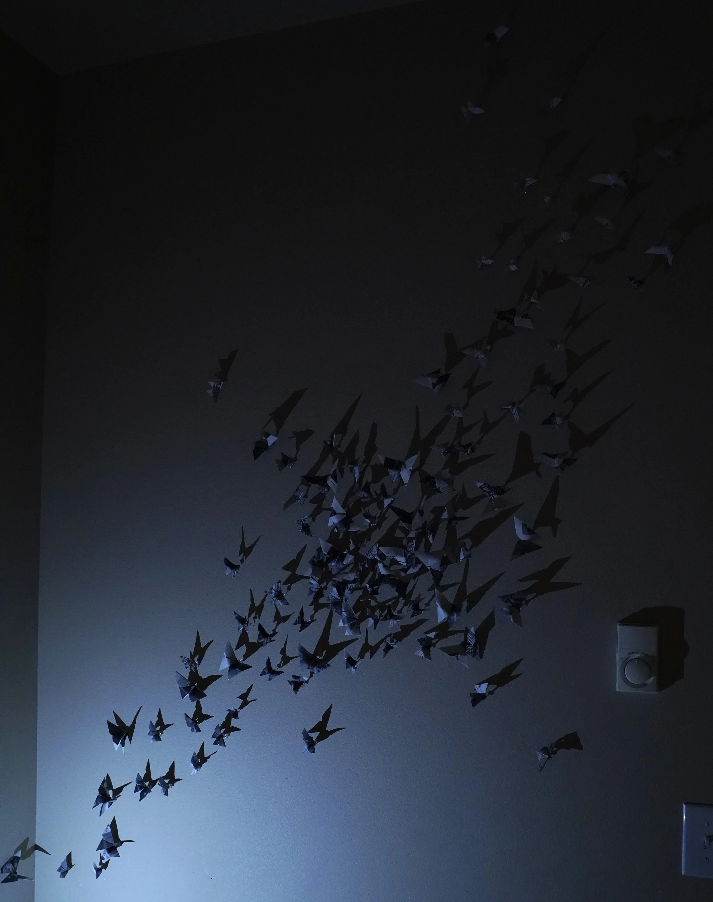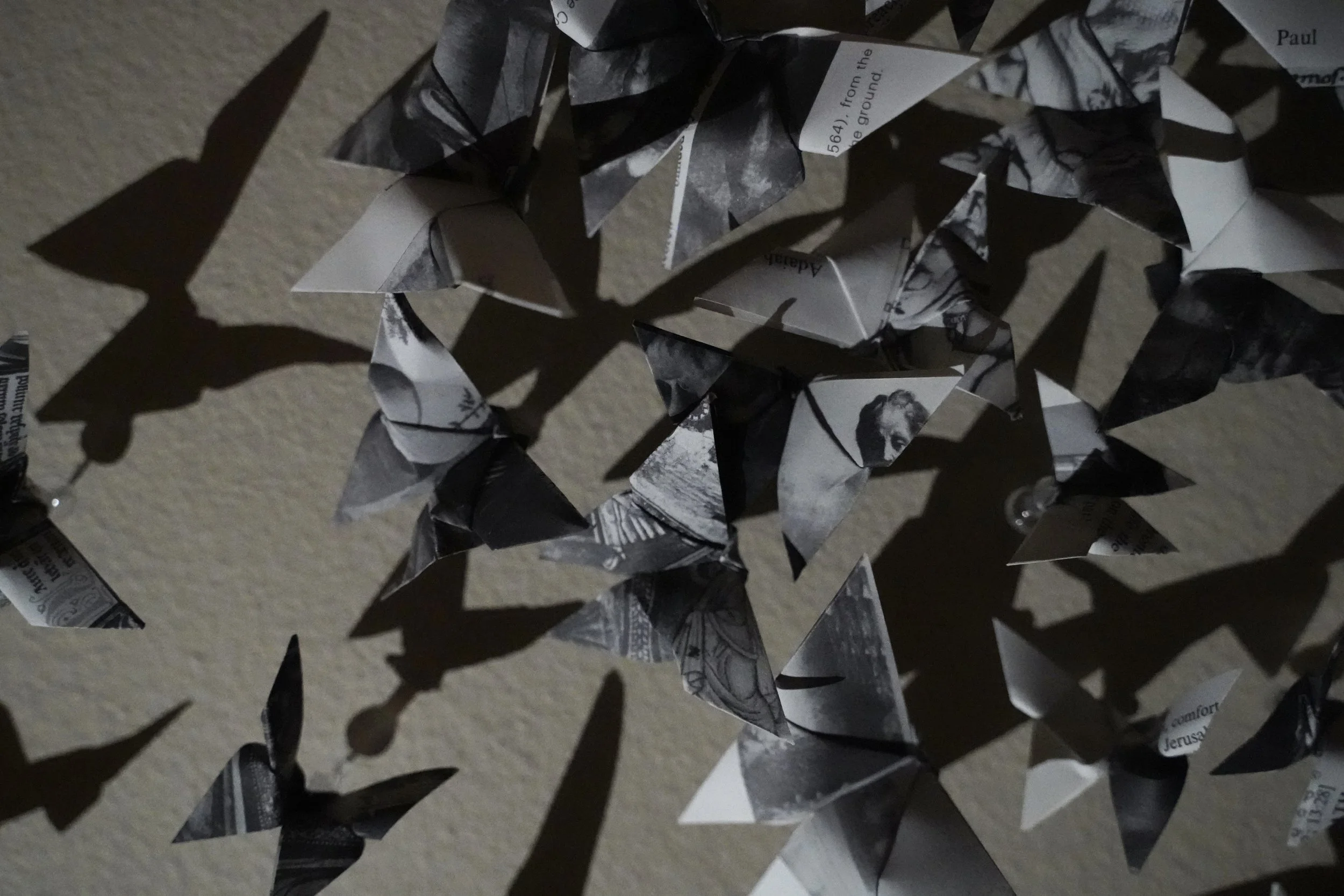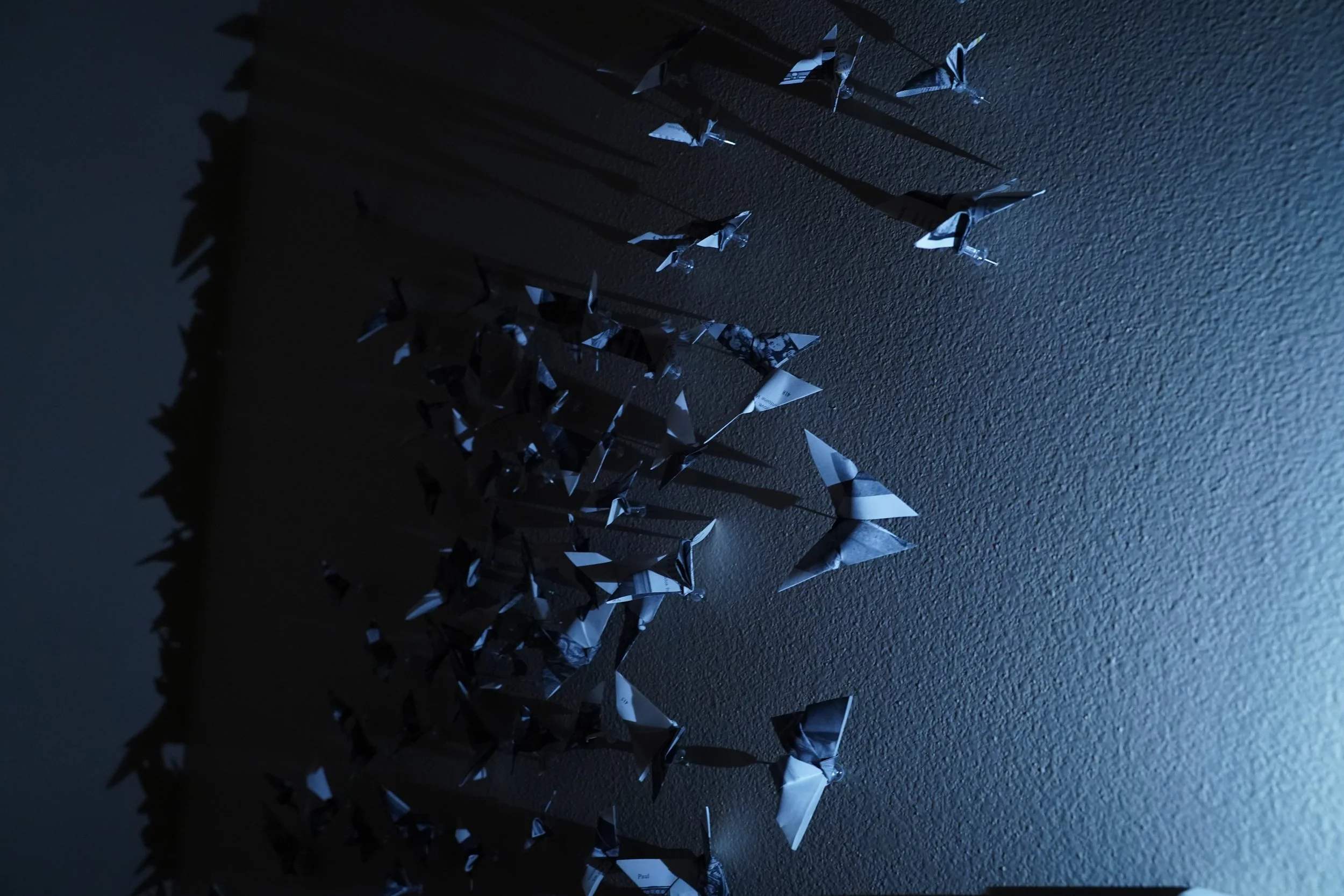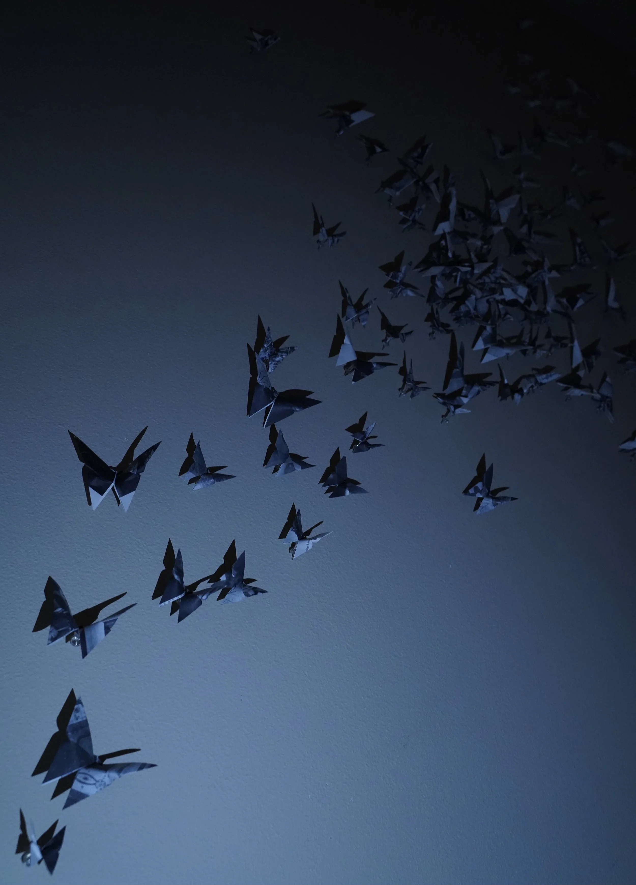 The repeated butterfly motif, constructed from religious imagery and text, fuses ideas of influence, inheritance and identity with those of path, free will, and expression. Bruce traces his own painful experiences from childhood, and his journey from them, with the flight path of butterflies frozen in time. Bruce sees this installation as the observing of a single point in time, an opportunity to consider that which is usually surrounded in movement and elusiveness.